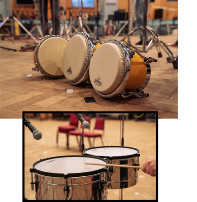- A pair of original 1940s RM1B ribbon microphones placed in front of the conductor to create a vintage scoring stage sound