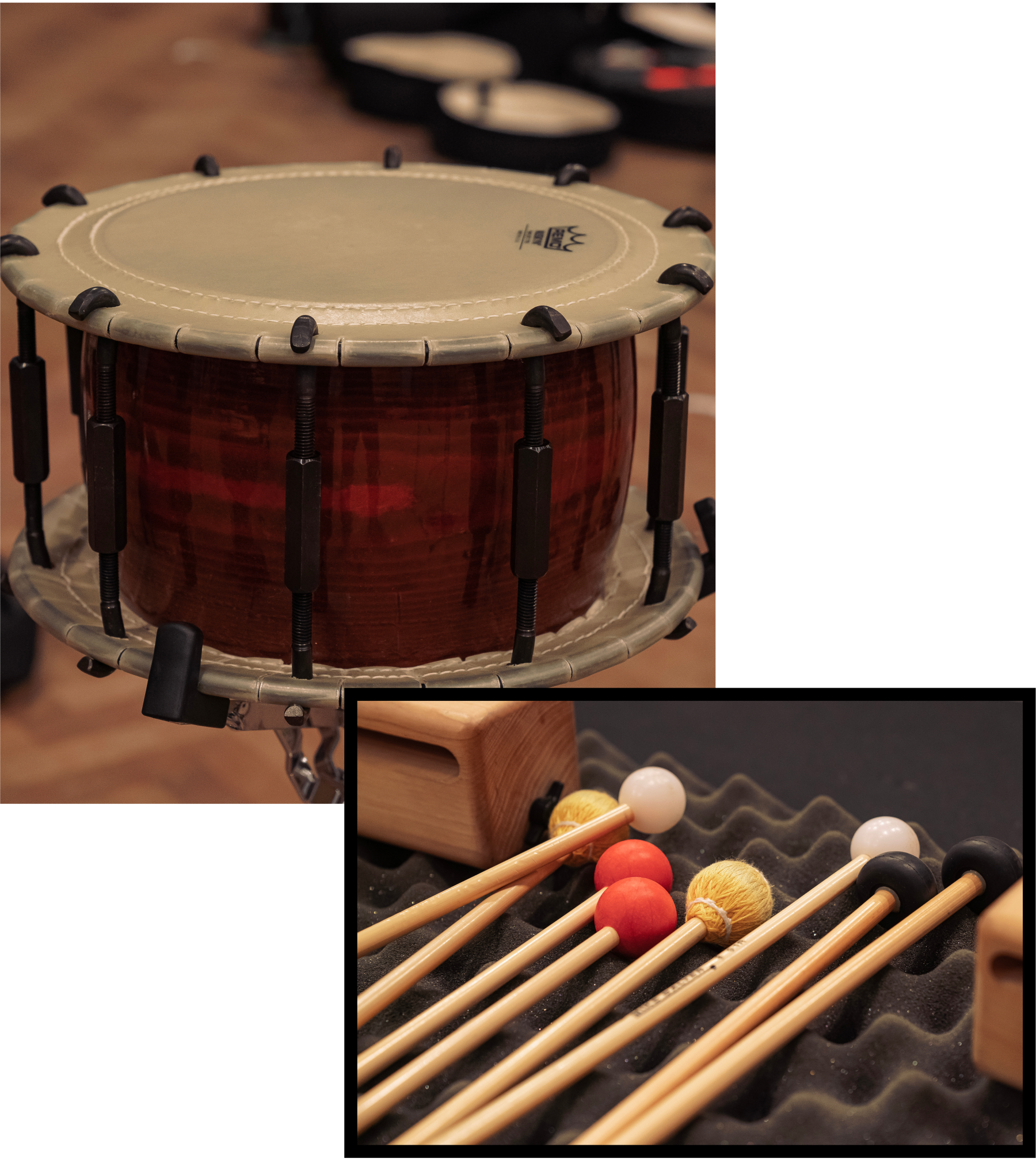 - Single hits performed with rubber mallets producing a balanced and articulate tone which brings out the character of these instruments