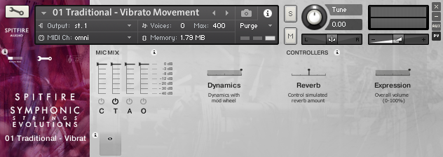 This is the main interface for melodic instruments. Its default view displays all available playing techniques, has a simple microphone mixer and includes the main feature controllers.
