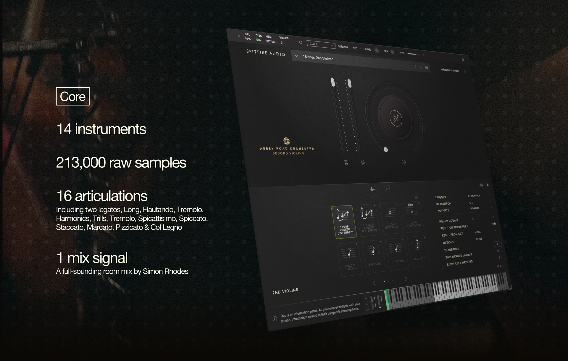 The stunning sound of a 2nd Violin section - captured at Abbey Road Studios. This virtual instrument offers key articulations and playing styles: lyrical and performance legatos, a wide selection of longs and shorts, and control over a variety of articulations, allowing you to create both intimate and epic soundscapes.