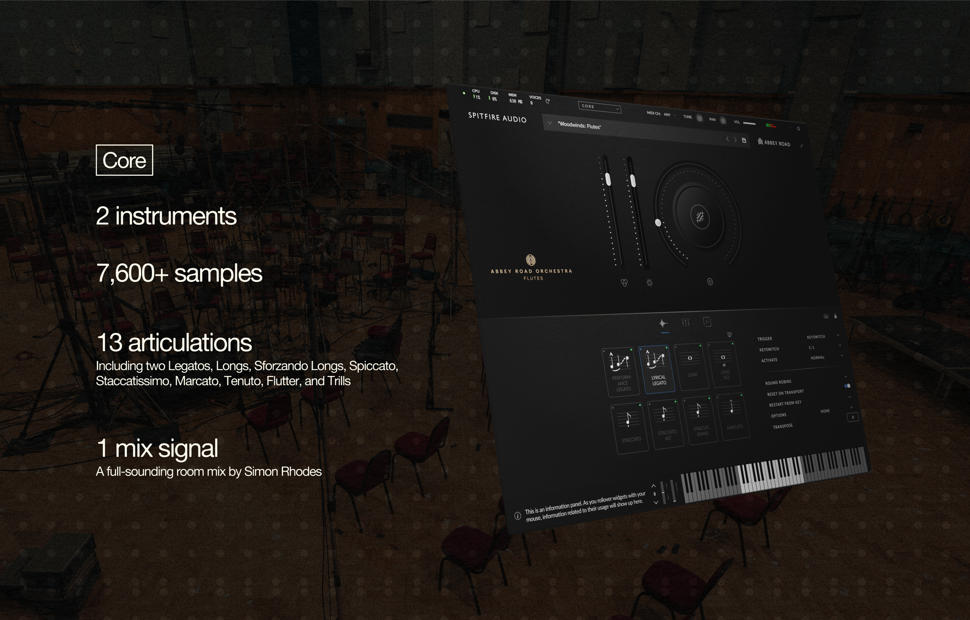 The stunning sound of a world-class Flutes a2 section - captured at Abbey Road Studios. This virtual instrument offers key articulations and playing styles: lyrical and performance legatos, a wide selection of longs and shorts, and control over a variety of articulations allowing you to create both intimate and epic soundscapes.