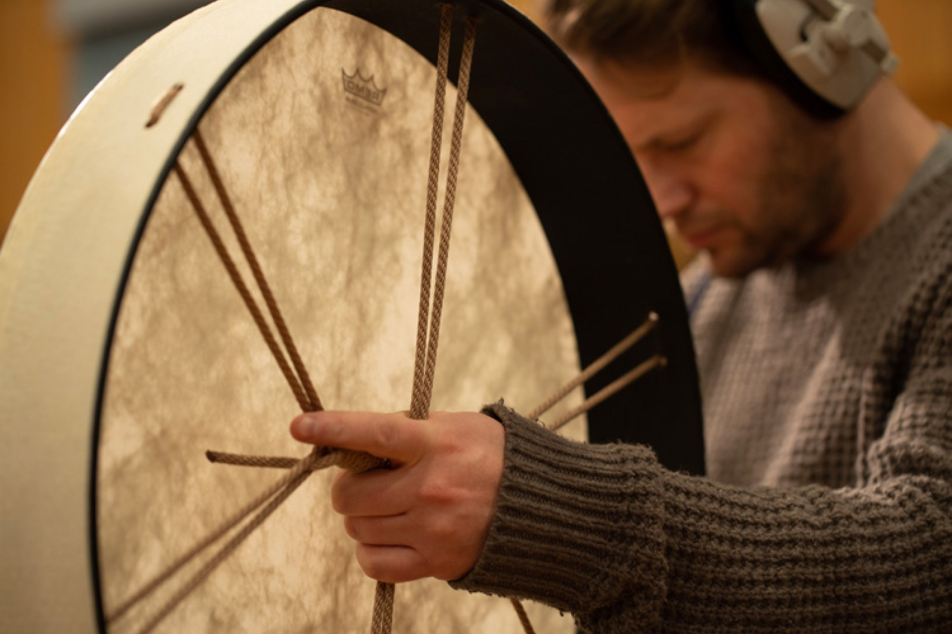 Wooden drum sticks on the rim of the drum to produce a 'tapping' sound