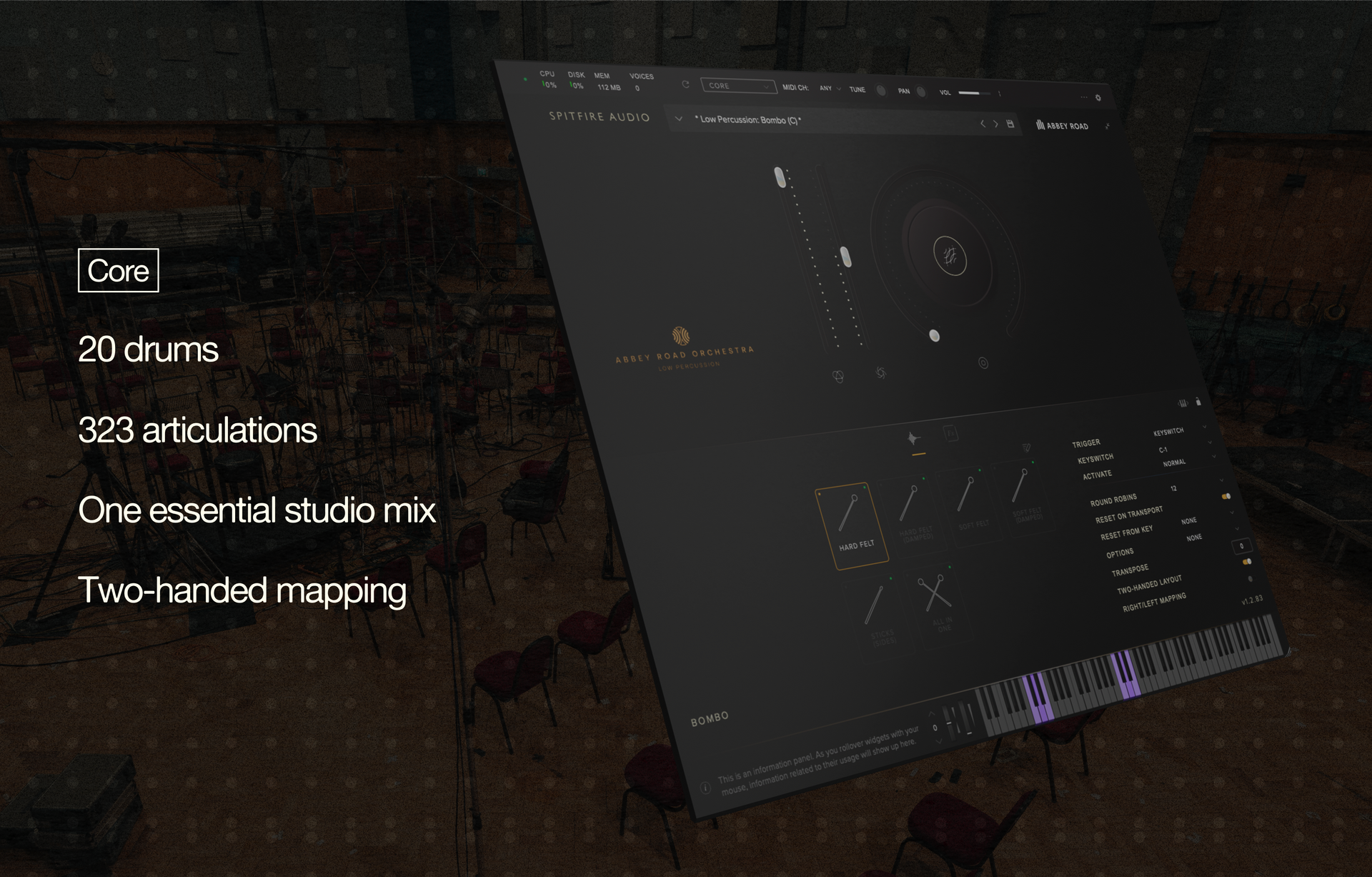 Experience the ground-shaking power of orchestral low percussion with the Core edition of our acclaimed Abbey Road Orchestra series. This iteration includes the same comprehensive suite of 20 thunderous bass drums – from the Surdo and Gran Cassa to the enormous 60” Giant Taiko – and offers identical detail in the selection of beaters, techniques and articulations. Low Percussion Core focuses the sound into one essential microphone mix, locking the sound of Studio One into the groove.