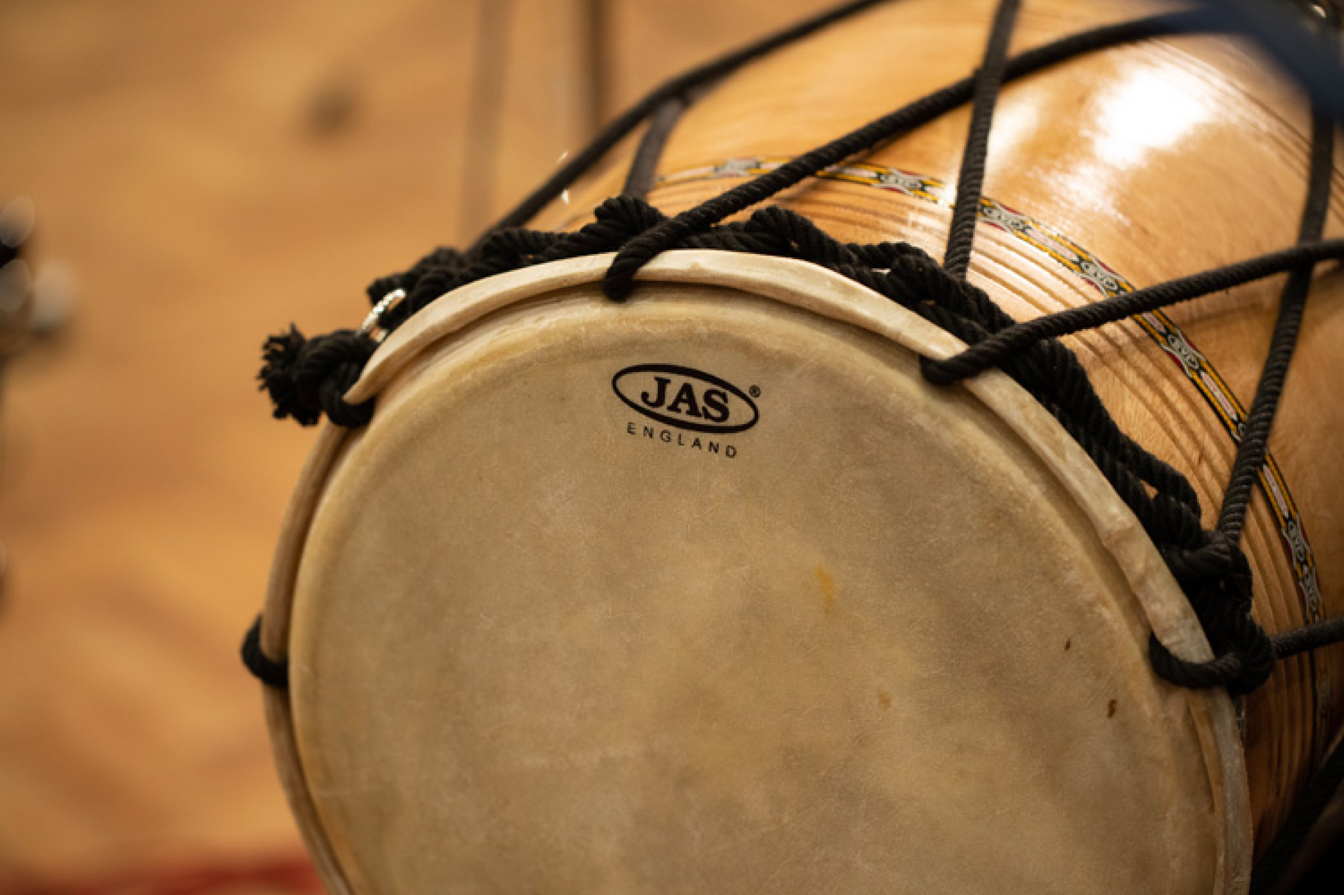 A two-headed drum from the Indian subcontinent. Each head is struck with a different beater to produce the dhol's signature tones, typical in Bhangra and other Indian genres.