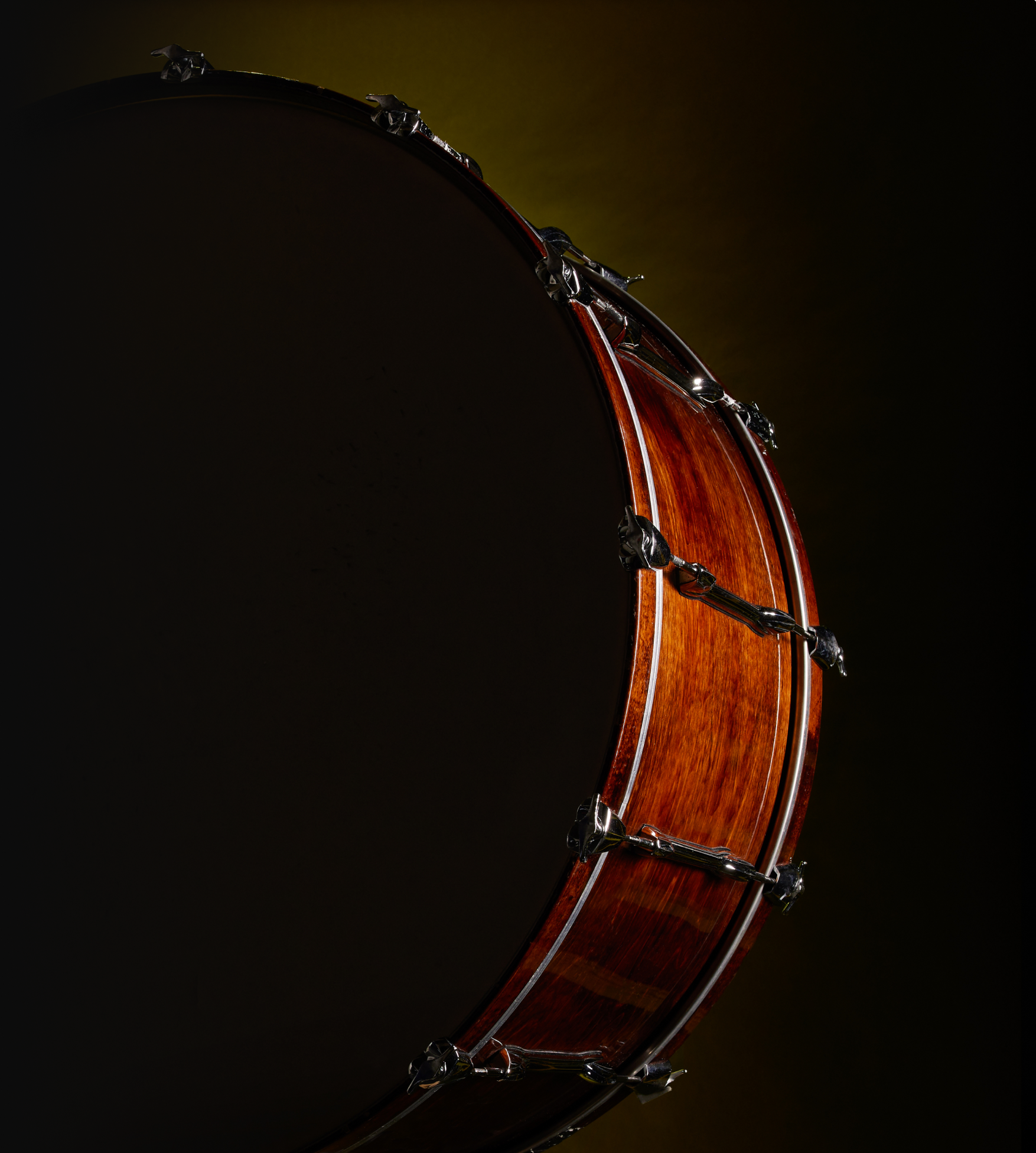 A vintage concert bass drum with a single 32” head on a shallow open shell. This drum combines a defined attack, woody overtones and balanced resonance.