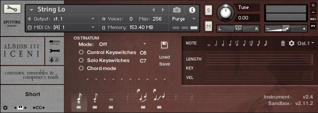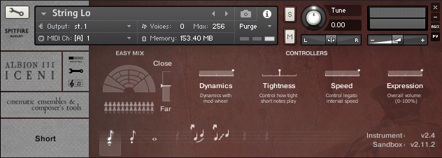This is the main interface for melodic instruments. Its default view displays all available playing techniques, has a simple microphone mixer and includes the main feature controllers.