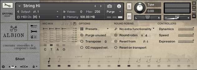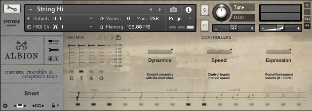 This is the main interface for melodic instruments. Its default view displays all available playing techniques, has a simple microphone mixer and includes the main feature controllers.