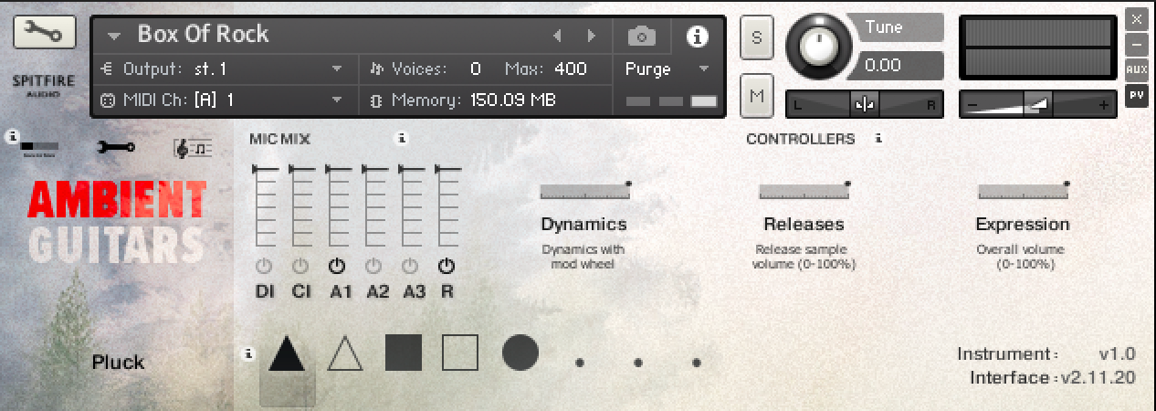 This is the main interface for melodic instruments. Its default view displays all available playing techniques, has a simple microphone mixer and includes the main feature controllers.