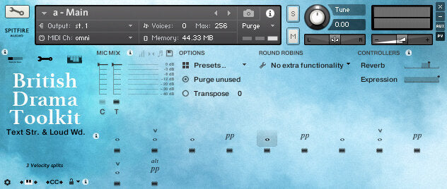 This is the main interface for melodic instruments. Its default view displays all available playing techniques, has a simple microphone mixer and includes the main feature controllers.