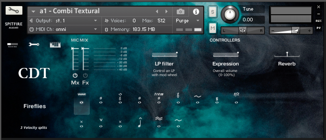 This is the main interface for melodic instruments. Its default view displays all available playing techniques, has a simple microphone mixer and includes the main feature controllers.