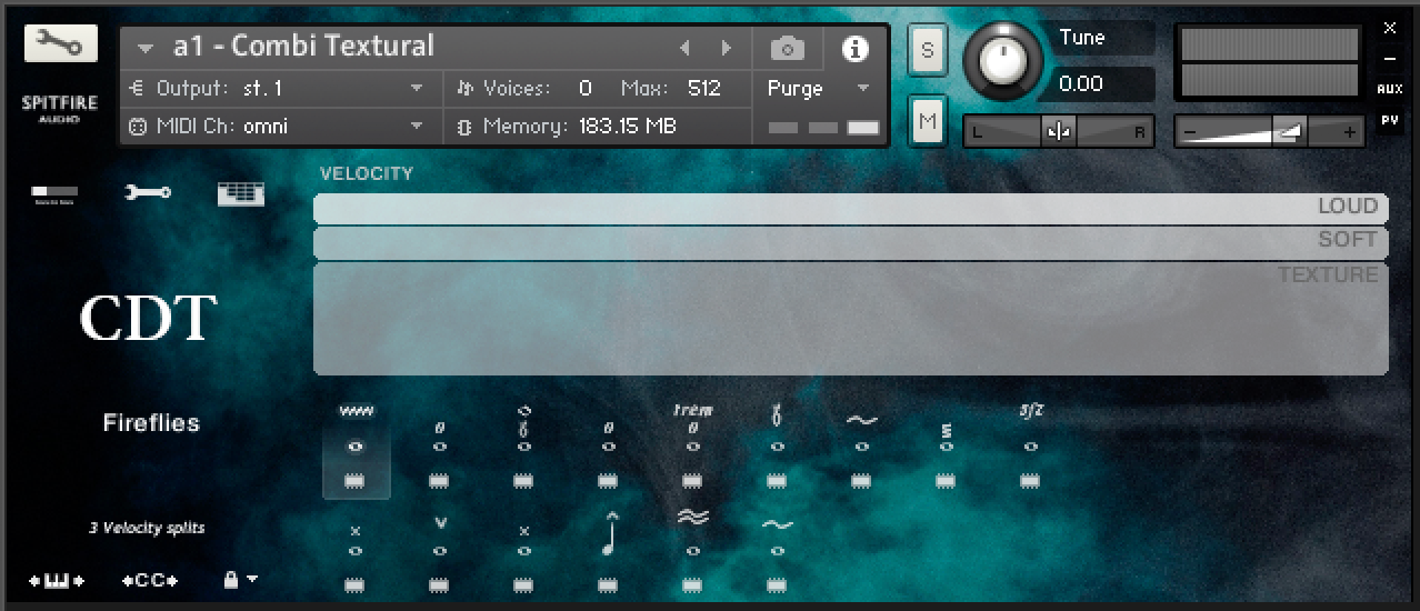 This view shows the velocity layers of each note played in a patch. Some patches include Texture, Soft and Loud layers, while others create a rich sound from one or two layers. Unlock the potential of each patch by adjusting your playing dynamics.