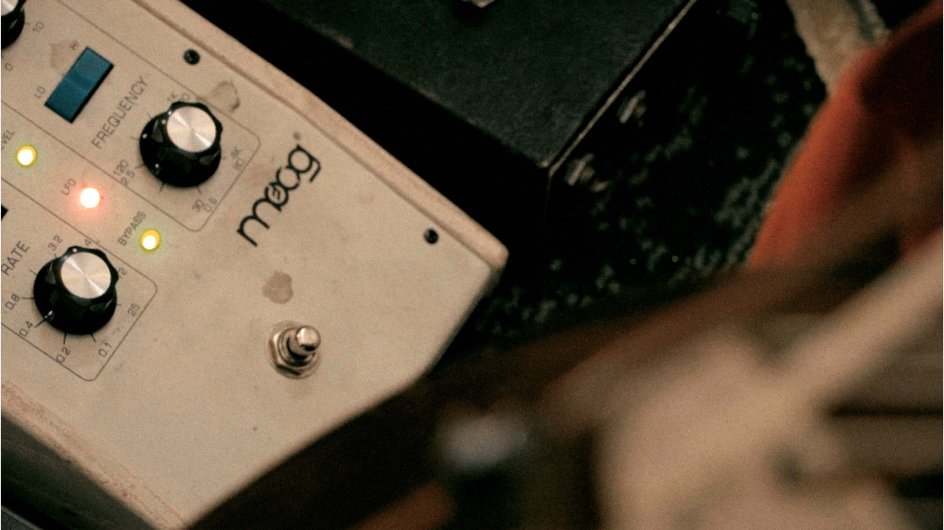 include her Tascam Portastudio, Slim phatty Moog synth, multiple tape players, a custom-made fuzz pedal, a Roland SP 404 and a Moogerfooger ring modulator.