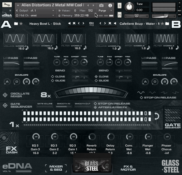 This interface houses our own sample-synthesiser engine. You can use it to combine two sounds and modulate between them with envelopes, filters and wobbles per sound, as well as a gate sequencer and a selection of go-to FX.