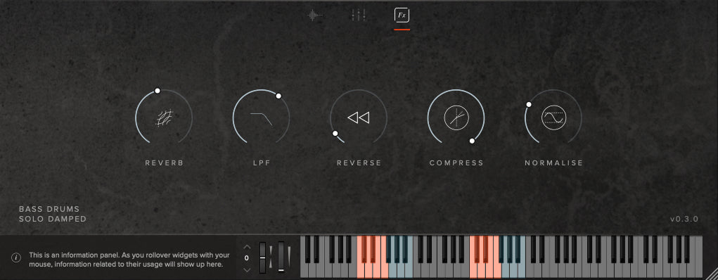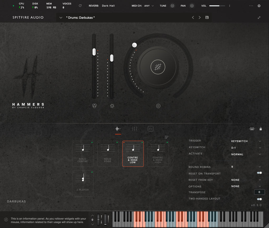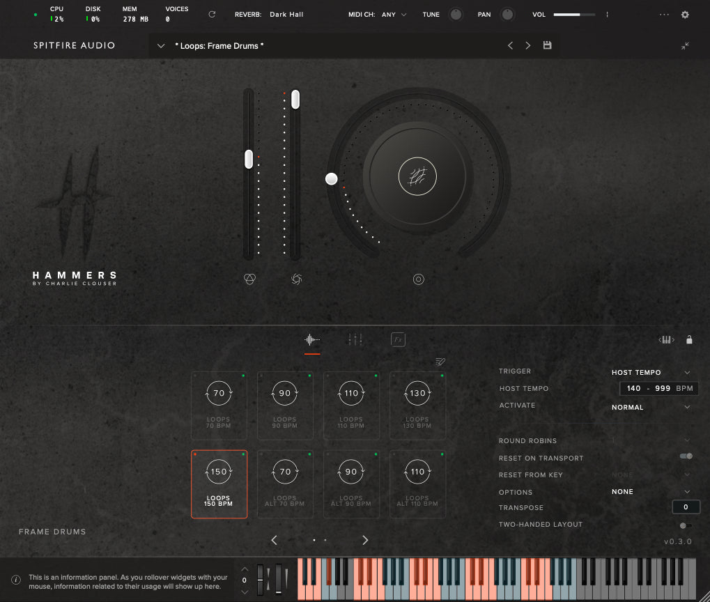 A custom “key brick” layout was developed by Charlie allowing for a wide range of MIDI performance styles, with total consistency across the drum types in Hammers. Laying out each drum across six adjacent keys following the same order (Hit, Ruff, Hit, Flam, Hit, Roll) allows you to play the hits and ornaments in between them for quick improvisation. This then repeats up the keyboard giving you the option to move MIDI performances between drums by simply dragging the MIDI information up or down the keyboard or to other instances of Hammers. Except for a few of the miscellaneous Scrap Metal sounds, this mapping scheme is completely consistent across every drum type, so it’s a matter of seconds to take a finished performance from the Darbukas and hear it playing back perfectly on the Frame Drums, Surdos, Roto-Toms, or any instrument in the library.