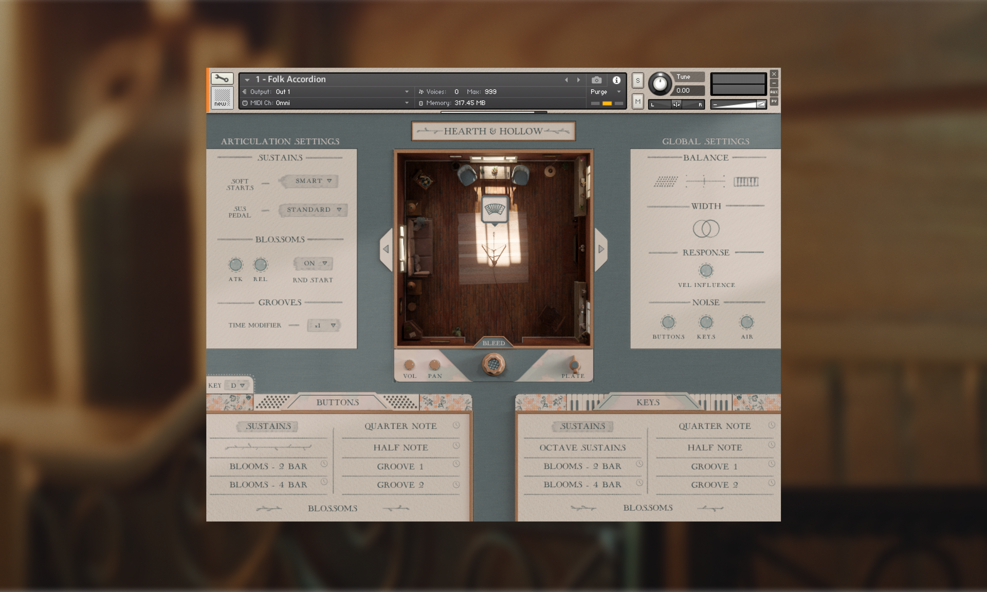A hallmark of all Hearth & Hollow instruments, our intuitive Room Control allows you to position your accordion within the recorded living room space and blend in its natural ambience. For the first time, you can also seamlessly transport your Folk Accordion into the iconic rooms of the original Plucked Folk Ensemble or Folk Voices, creating a cohesive sonic tapestry and spatially tying all three libraries together.