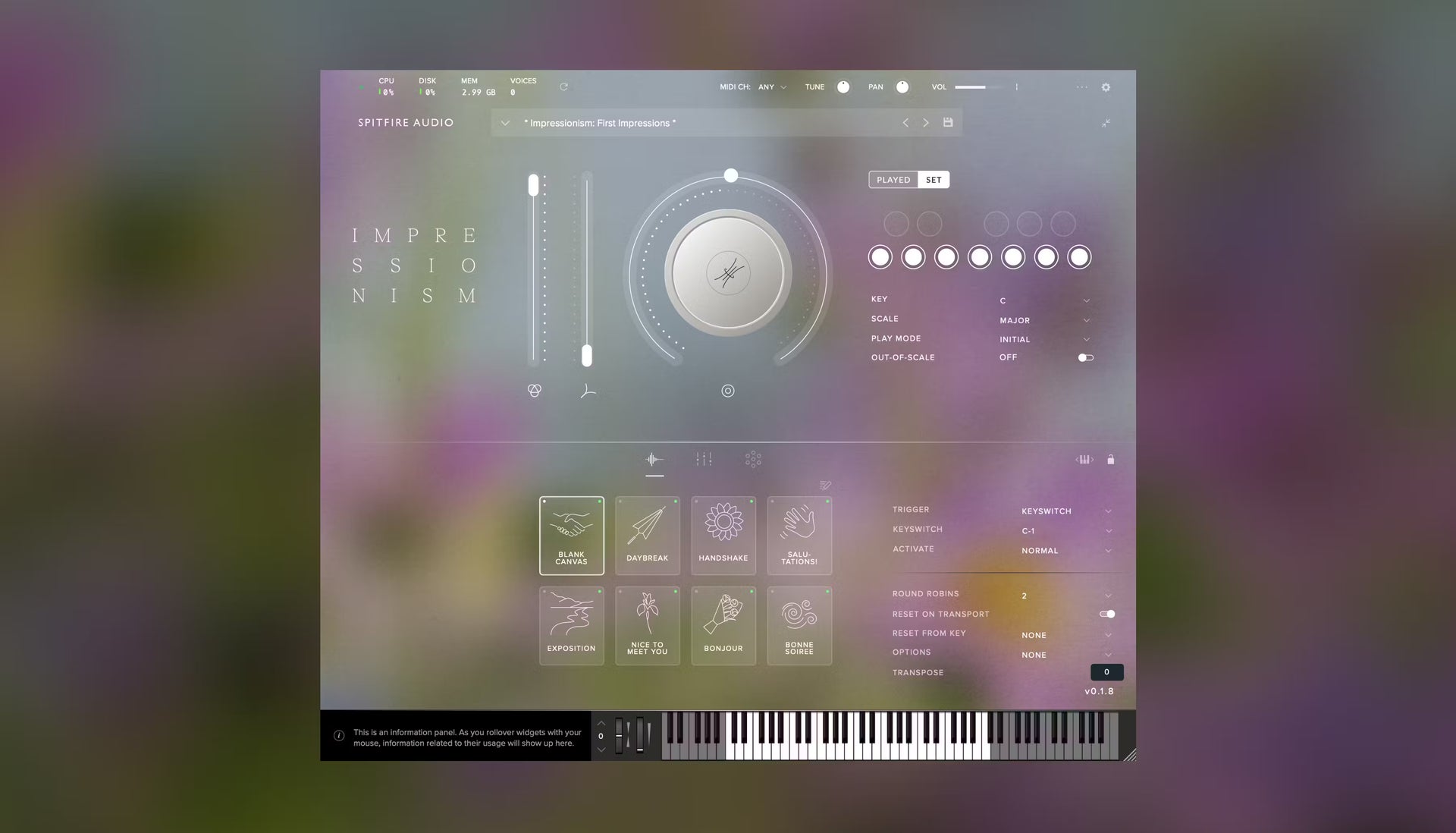 Unconventional both in articulation and instrumentation, Impressionism blends diverse textures in instrumental sound from across the orchestra and beyond. It layers evolving, three-part stories for each note you play: first, a short, percussive attack, akin to the tentative touching of brush to canvas. Then comes a soft swell, the sonic embodiment of a thick smear of oil paint.