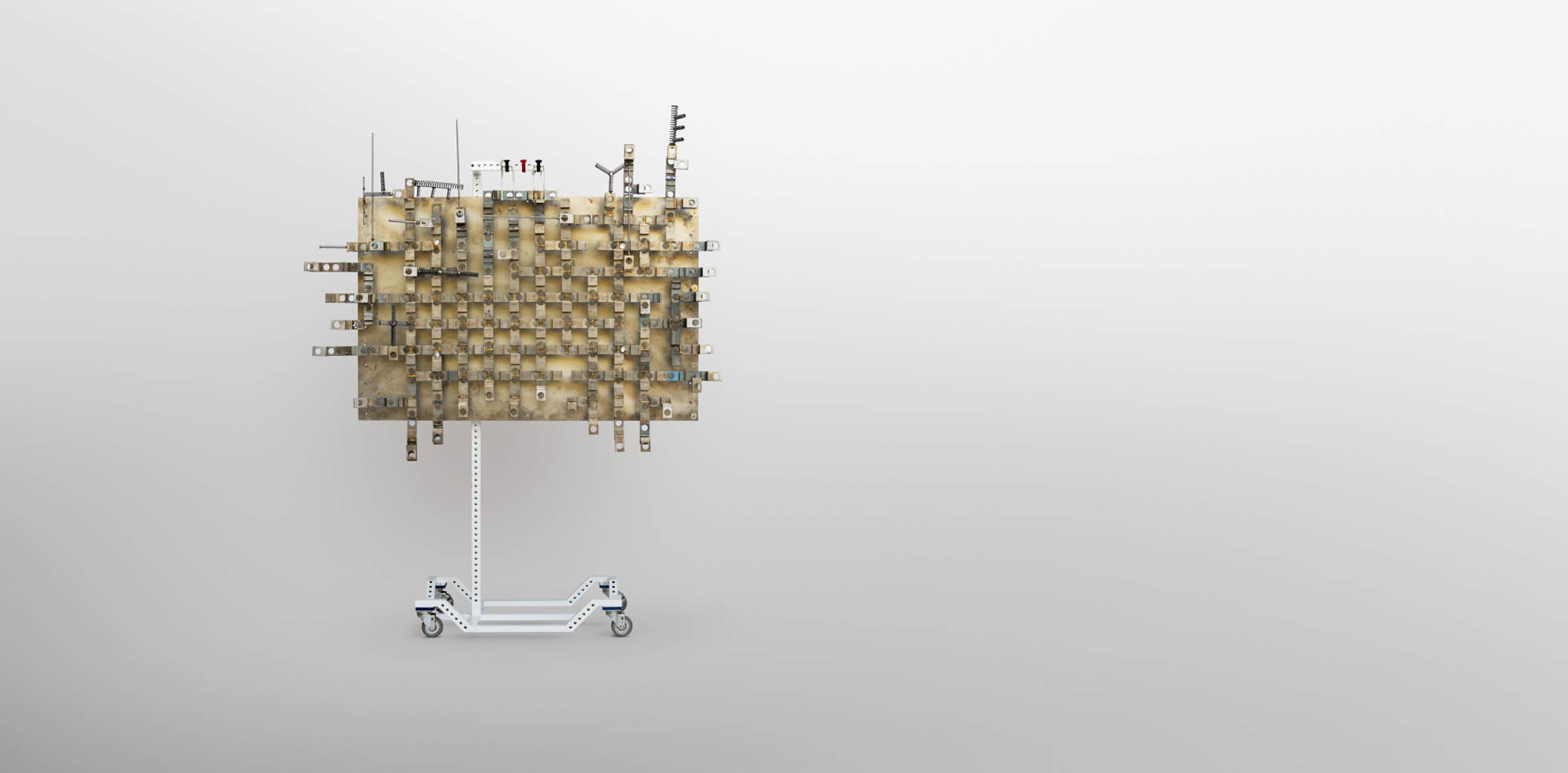 Inconel rods with aluminium resonators on a turbine blade. Inspired by Harry Bertoia.