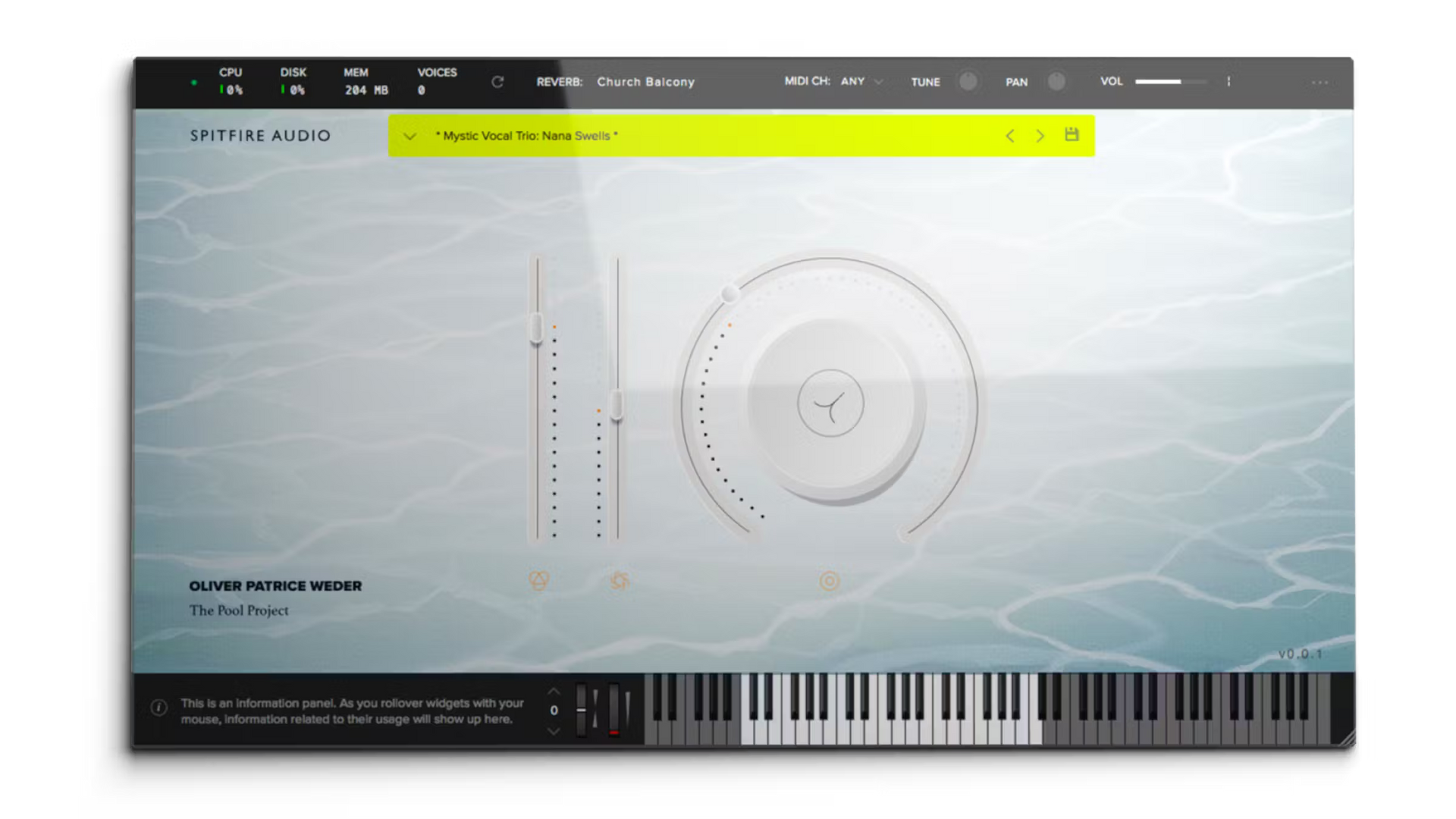 While Weder’s first sample library and record, OPW, was inspired by constant movement and travelling, The Pool Project is a tribute to peace and stillness. At the core of the library are male vocal swells, longs and vowel sounds performed by Madrid’s Club del Rio, which blend beautifully with woodwind duo Zopli2’s breathy alto flute and bass clarinet swells and visceral playing techniques, including circular breathing. This is accompanied by Weder’s very own personalised double felted and tape piano sounds, synthesiser loops from his Juno 6 fed through various pedal effects and electronic manipulations, and a unique selection of toys and percussion hits and loops, providing gentle rhythm and momentum, including the steel tongue drum, toy piano, recorder, and kaval (a Bulgarian flute). The specially curated controls, effects and IR reverbs invite you to tailor the sounds to your specific production needs within the plug-in, with the Distort setting taking the organic recordings to a completely new place.