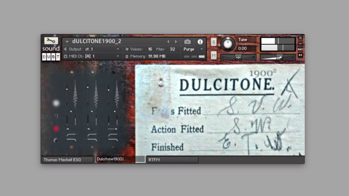 This rare instrument is the world’s first multi-sampled 134 year old Dulcitone, and was the very first Sound Dust instrument. A woody, clonky sound reminiscent of a celeste, but more metallic sounding, with added octaves added to take it beyond what a normal Dulcitone can do.