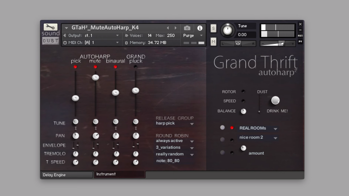 Grand Thrift AutoHarp² is what happens when you mate a tiny autoharp with a huge binaural plucked grand piano. A strange hybrid instrument, with four separate and individually adjustable layers of multi-velocity samples from every note of both instruments, recorded binaurally, with a pick and a mute, creating unique piano-like, plucky sounds. With multiple effects on the pluck, it really shakes the room.