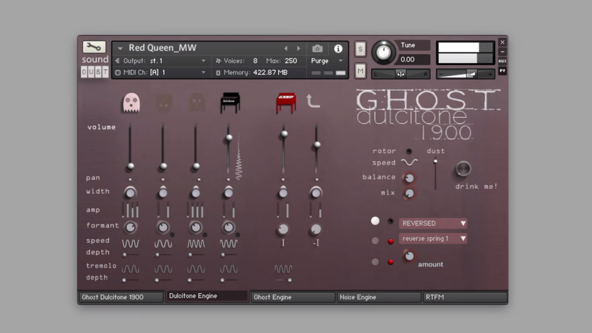 A creation of haunting beauty. Sound Dust have taken multisampling impulse responses and experiments originally used to create the Plastic Ghost Piano, and applied their nifty digital witchcraft to a rare collection of Dulcitones. Individual recordings of notes demonically convolved and fed with white noise to create the ghostly tone, layered with a roomy multi-sampled Nord electric piano, recorded binaurally for added depth and body. Think Danny Elfman’s The Night Before Christmas.