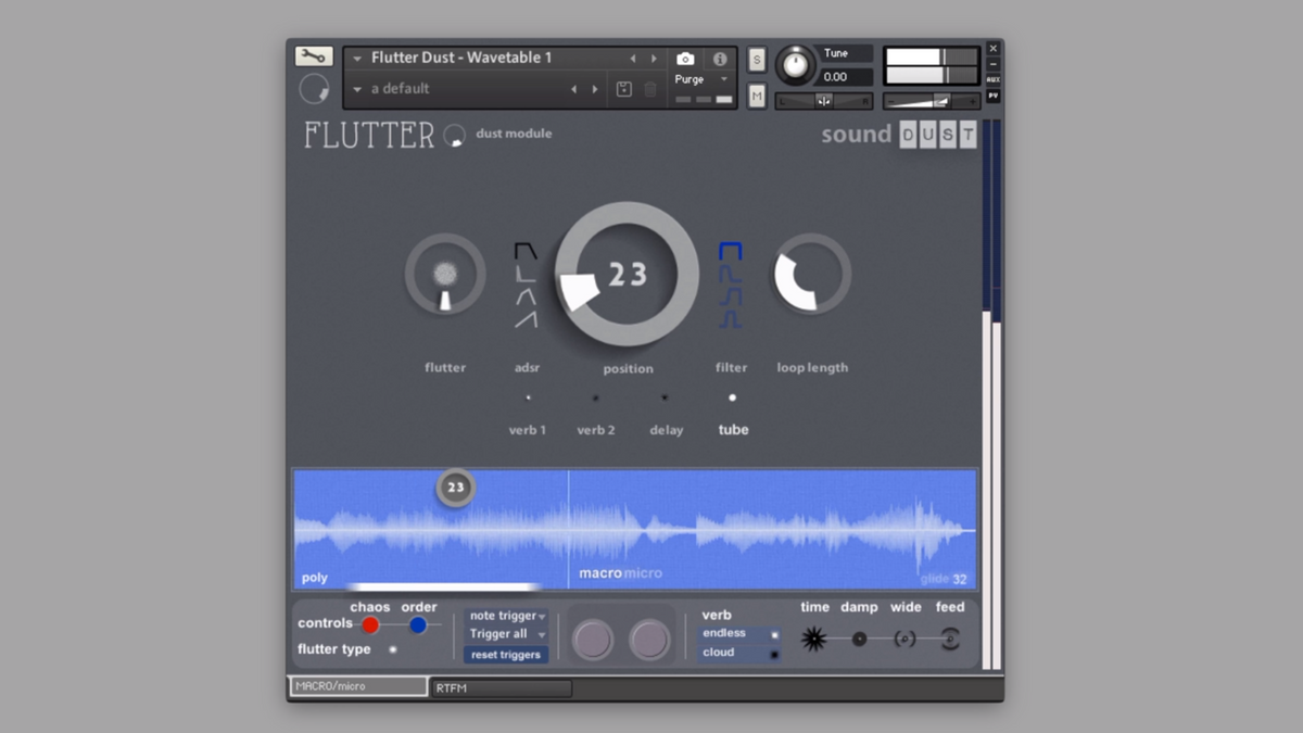 Made using existing Sound Dust instruments with added effects and parameters, the flutter engine jumps into different instruments at different positions, with different loop lengths. Like a Mellotron, Flutter Dust Module is based on recordings of acoustic instruments, but with extra functionality, taking you to places the tape-based Mellotron could only ever dream of.