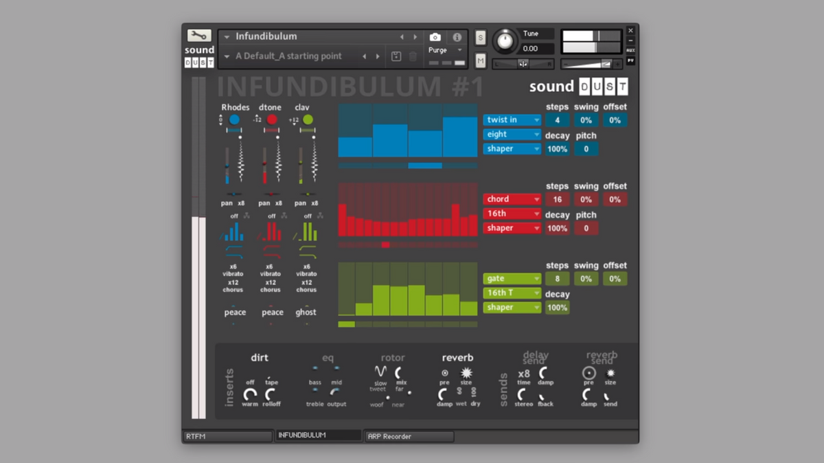 Taking its name from the time funnel in Kurt Vonnegut’s excellent time leaping novel, Sirens of Titan, Infundibulum is a multi-arp workstation and three-part sequencing machine, Infundibulum offers you a playground of polyrhythmic possibilities with perfect for creating unusual textures, rhythmic textures like ostinatums and interesting cross-rhythms, and different types of sequencing. Three different arpeggiators that go at different speeds and lengths, featuring chimy piano sounds for an instant Steve Reich effect.