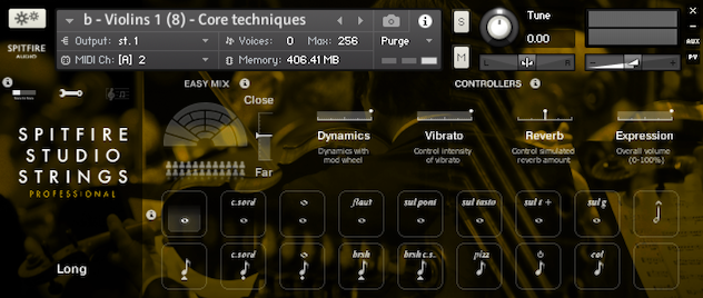 Studio Strings is a medium chamber (or small symphonic) ensemble recorded by section (1st violin, 2nd violins, violas, cellos and double basses), and is available in two versions: Spitfire Studio Strings and the more extensive Spitfire Studio Strings Professional.