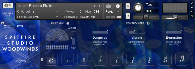 This is the main interface for melodic instruments. Its default view displays all available playing techniques, has a simple microphone mixer and includes the main feature controllers.