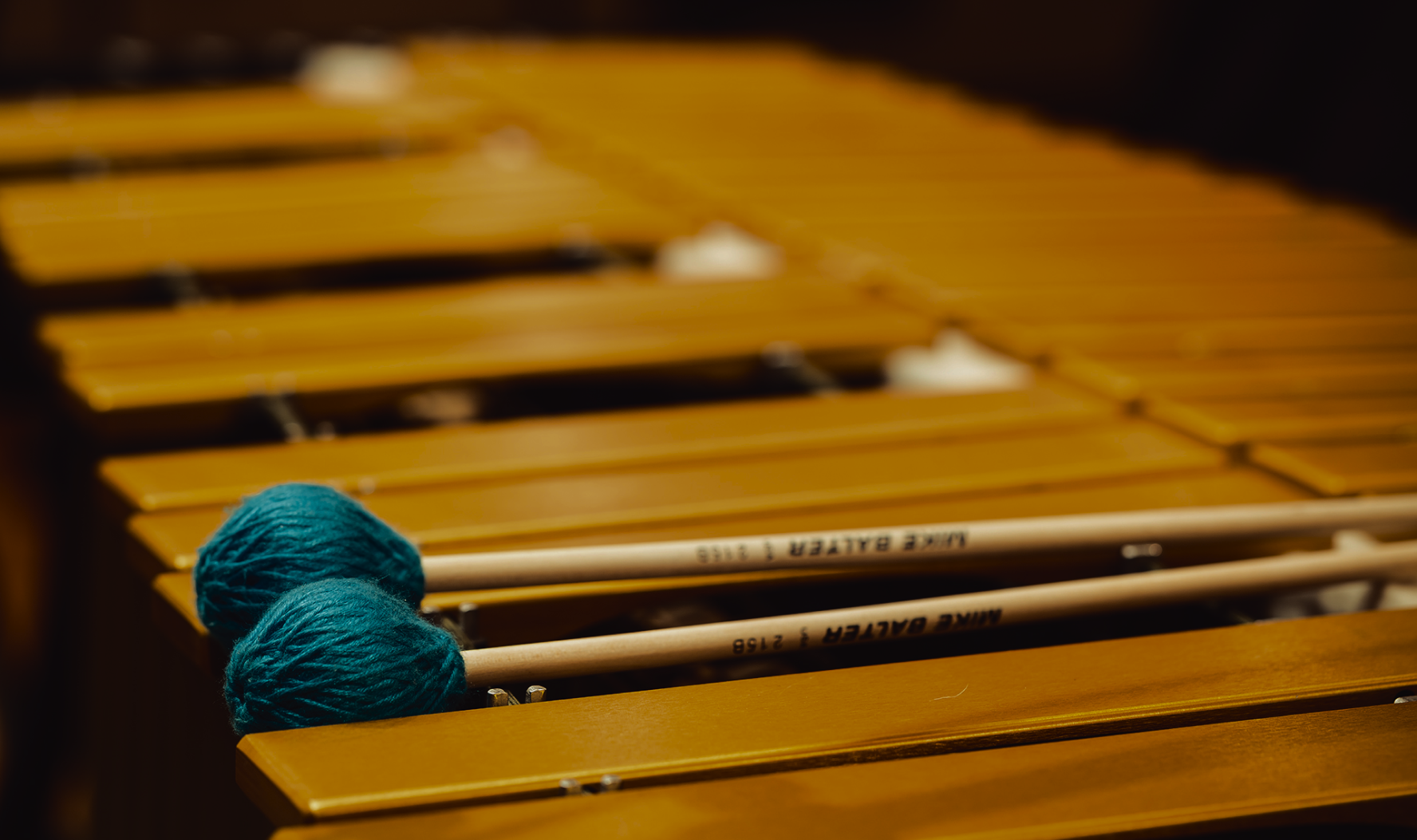 Nine marimbas performing tremolos, rolls, and hits with various sticks and techniques.