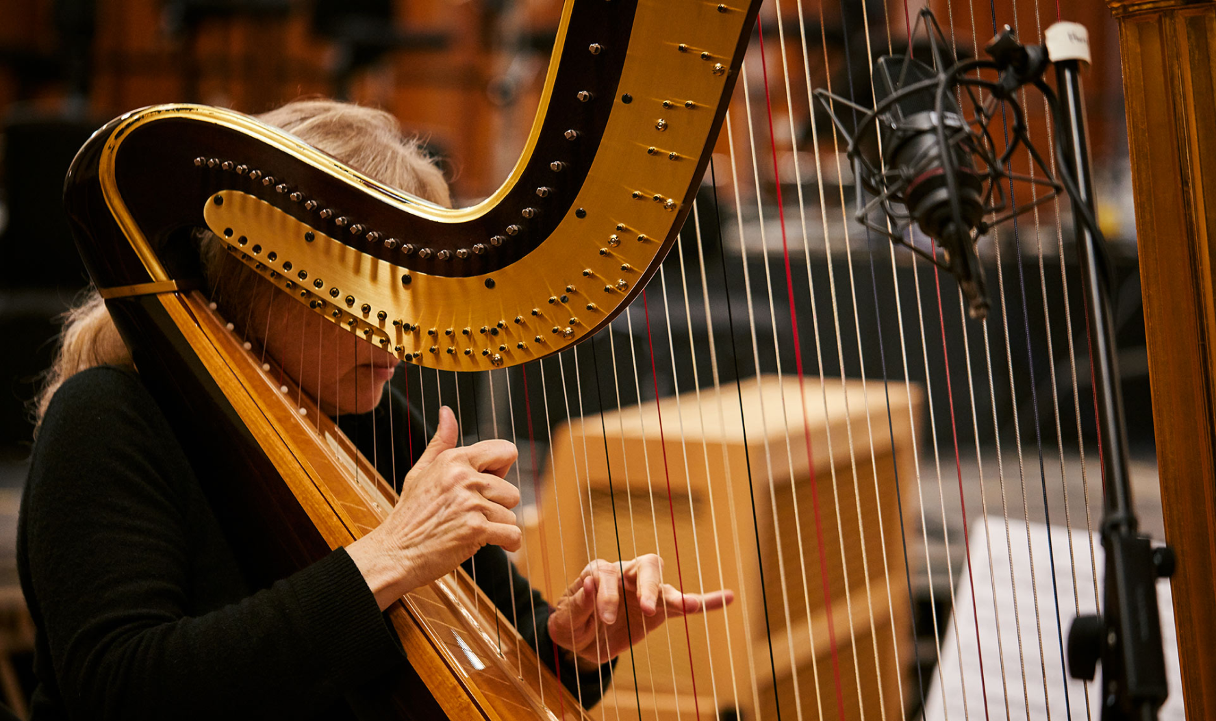 Nine harps playing a range of articulations, including slow and fast tremolos, plucks (long, short, and harmonics), and an extensive selection of glissandi.