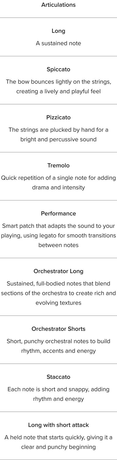 An articulation is the way a note is played or expressed, shaping its character and emotion. It can make the same note sound smooth, sharp, bold or even delicate. Here are some of the main articulations that are included in SSO Discover: