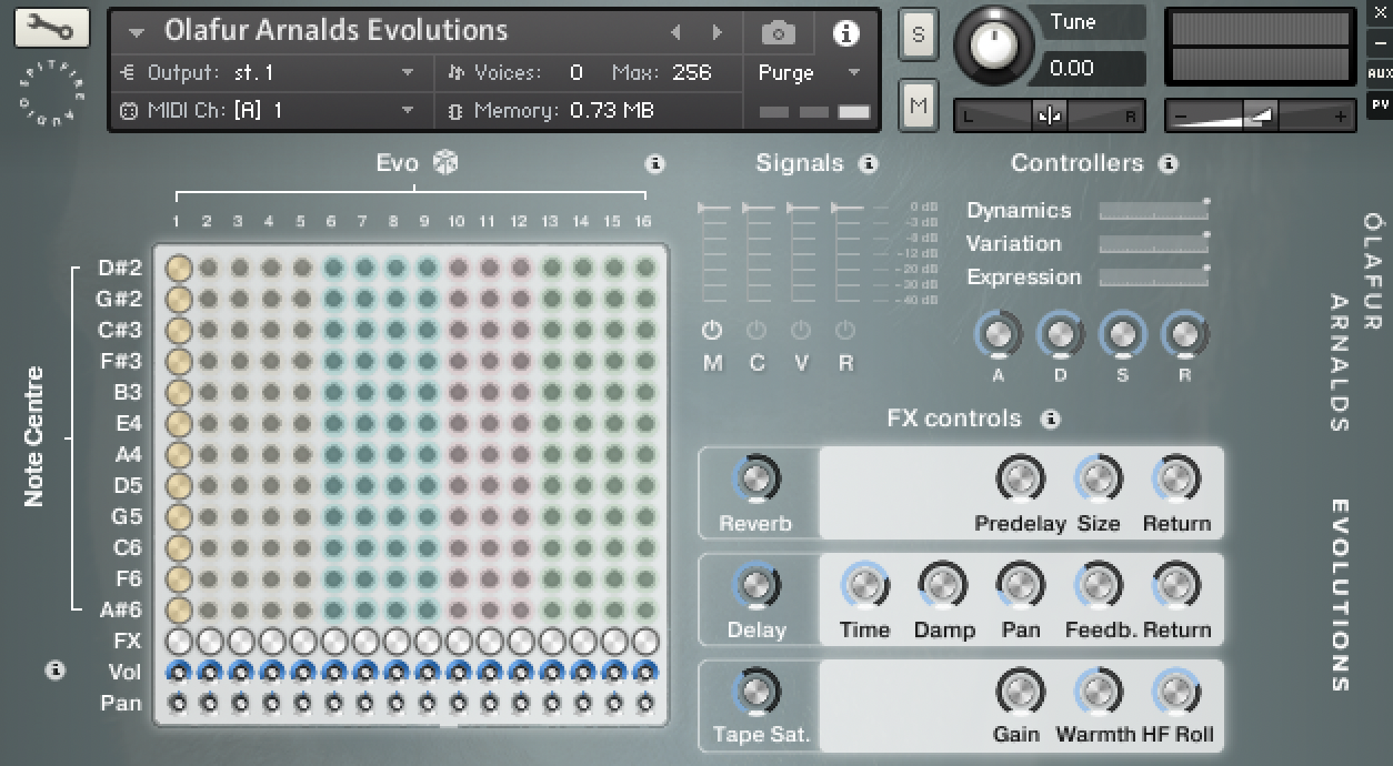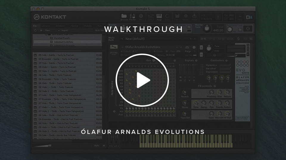 Ólafur Arnald's evolutions use Spitfire's revolutionary Evo Grid system to provide you with an almost infinite number of outcomes. Days were spent creating and discussing ways in which the players could take a note and change it over long periods of time. These notes were then replayed across a number of different pitch centres. These were then placed on a peg board grid system based on the 'Putney' synth. Pitch centres down the x axis, the different evolutions or 'evos' down the right. Simply peg which Evo you want where or conversely hit our random dice function to automatically select a unique preset from over 30 trillion possible outcomes!